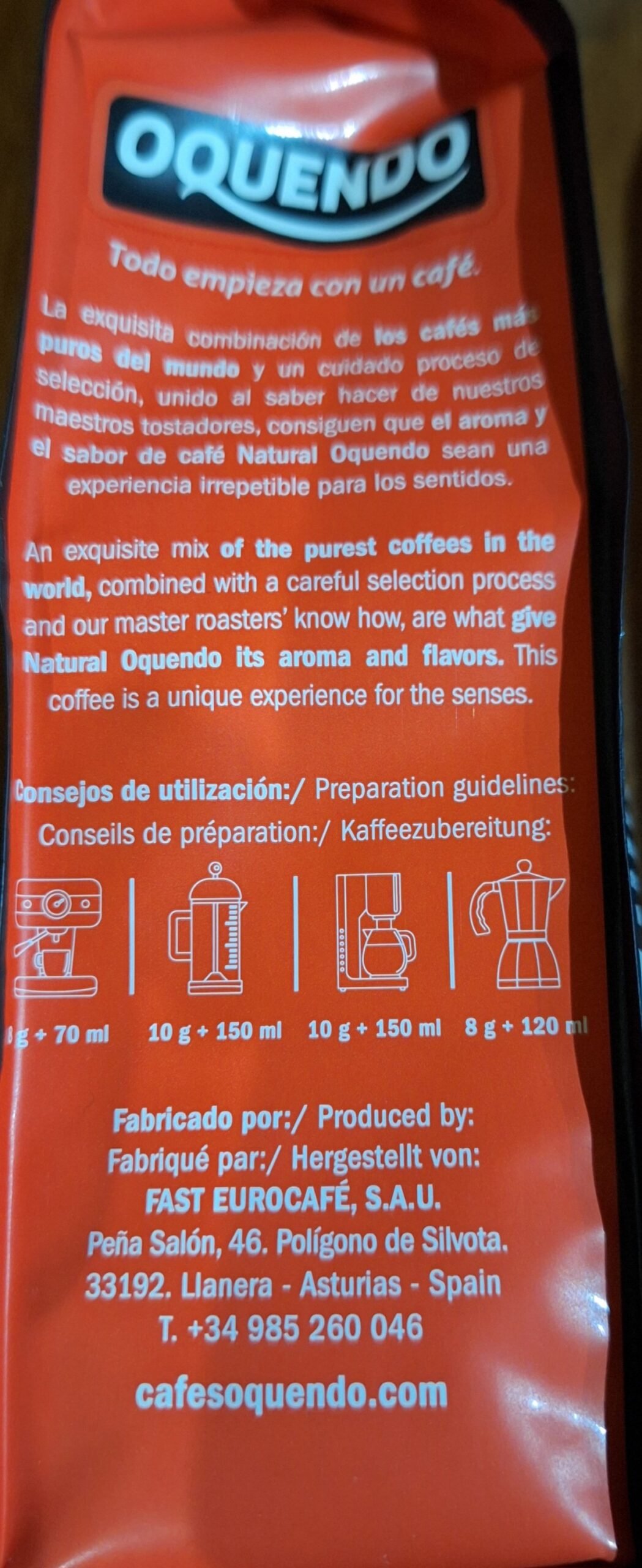 Café molido de tueste natural de la marca asturiana Oquendo. Intensidad 8