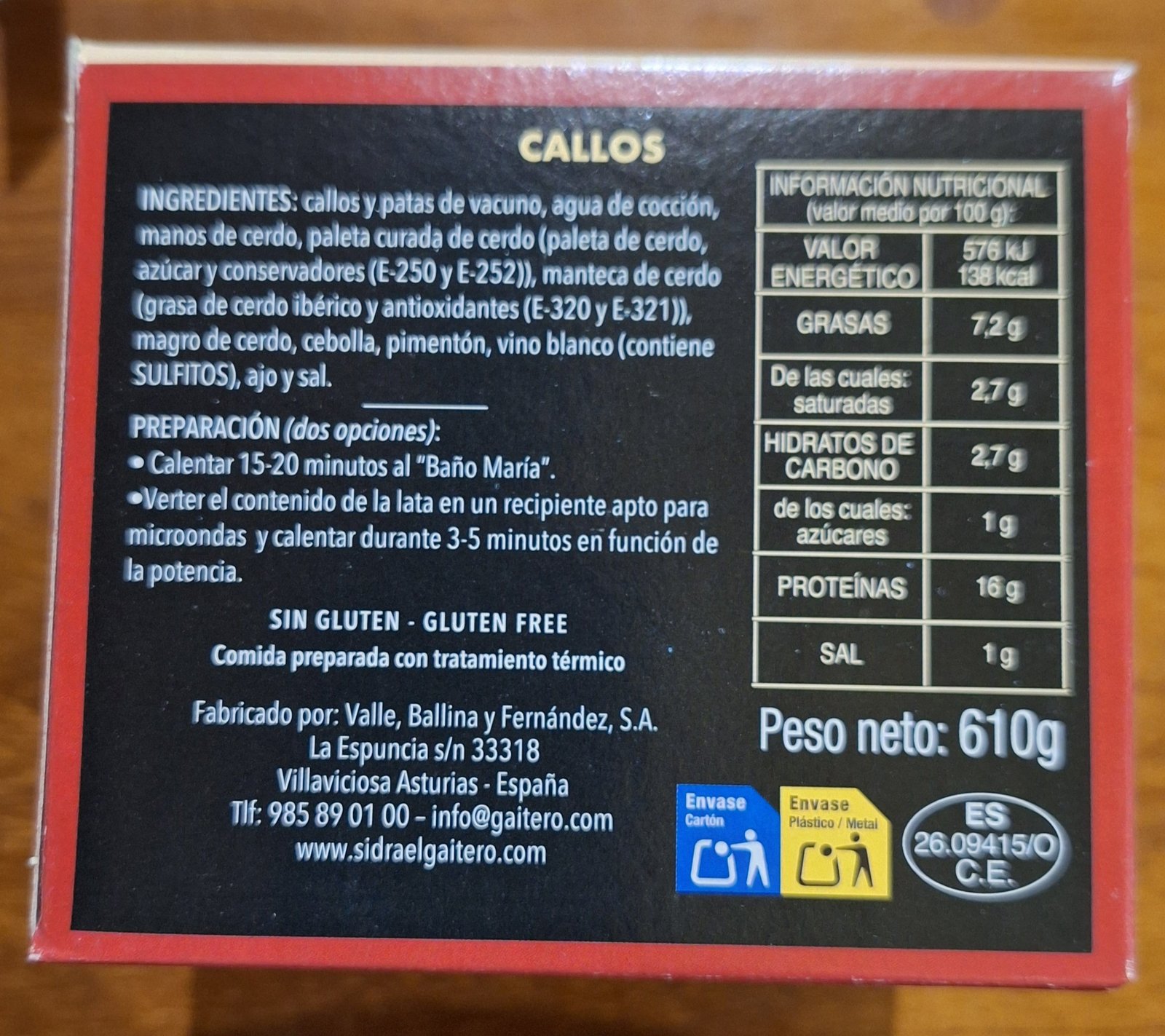 Callos Serie Oro de El Gaitero. Elaborados con callos y patas de vacuno, agua de cocción, manos de cerdo, paleta curada de cerdo, manteca de cerdo, magro de cerdo, cebolla, pimentón, vino blanco, harina de maíz, almidón de maíz, ajo y sal.