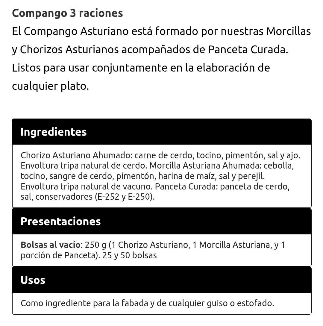 Compango Asturiano de la marca Naveda (Cabranes, Asturias). Pack formado por chorizo ahumado, morcilla ahumada y panceta curada. Ingredientes: chorizo (carne de cerdo, tocino, pimentón, sal y ajo. Envoltura de tripa natural de cerdo); morcilla (cebolla, tocino, sangre de cerdo, pimentón, harina de maíz, sal y perejil. Envoltura de tripa natural de vacuno); panceta curada (panceta de cerdo, sal, conservadores y antioxidante). Sin gluten. Conservar en lugar fresco y seco. Peso neto 250 g.