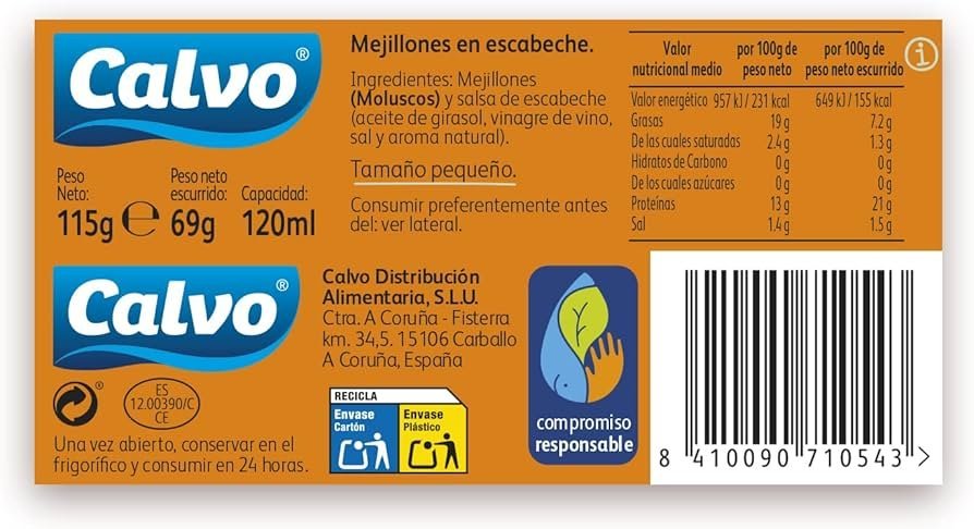 Mejillones en Escabeche. Ingredientes: mejillones, aceite de girasol, vinagre, especias y sal.
