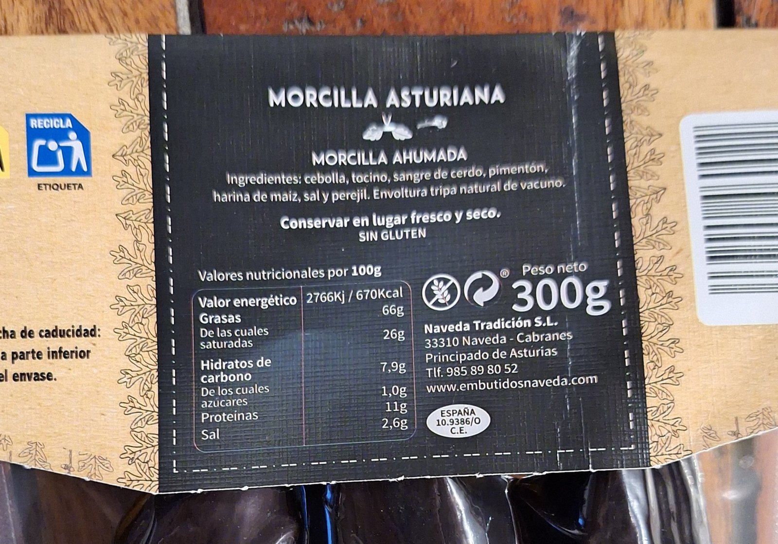 Morcilla ahumada elaborada con cebolla, tocino, sangre de cerdo, pimentón, harina de maíz, sal y perejil. Envoltura tripa de vacuno.